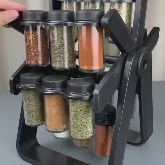 • PREMIUM MATERIAL: Spice Organizer For Countertop - Our spice holders hold 18 glass spice jars and are made of high quality glass. The rotating counter spice rack is made of heavy duty ABS, which is rust-proof, durable, and stable. Spice jar organizer rotates well and looks great